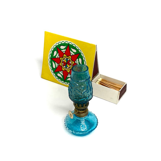 Blue Glass Mini Oil Lamp w/ Brass Dial - Vintage Midcentury Art Glass