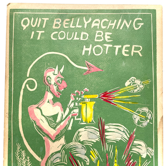 "Quit Bellyaching It Could Be Hotter" Flamethrowing Devil Linocut Print with Hand Coloring