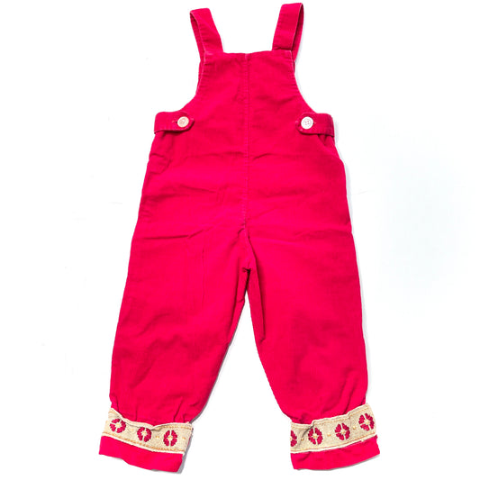 Patterned Appliqué Cuff Red Corduroy Overalls 2T