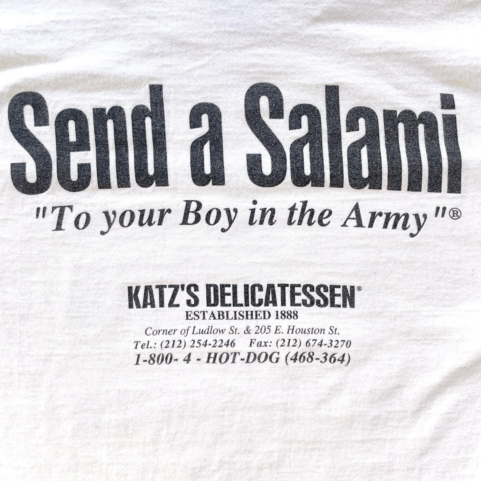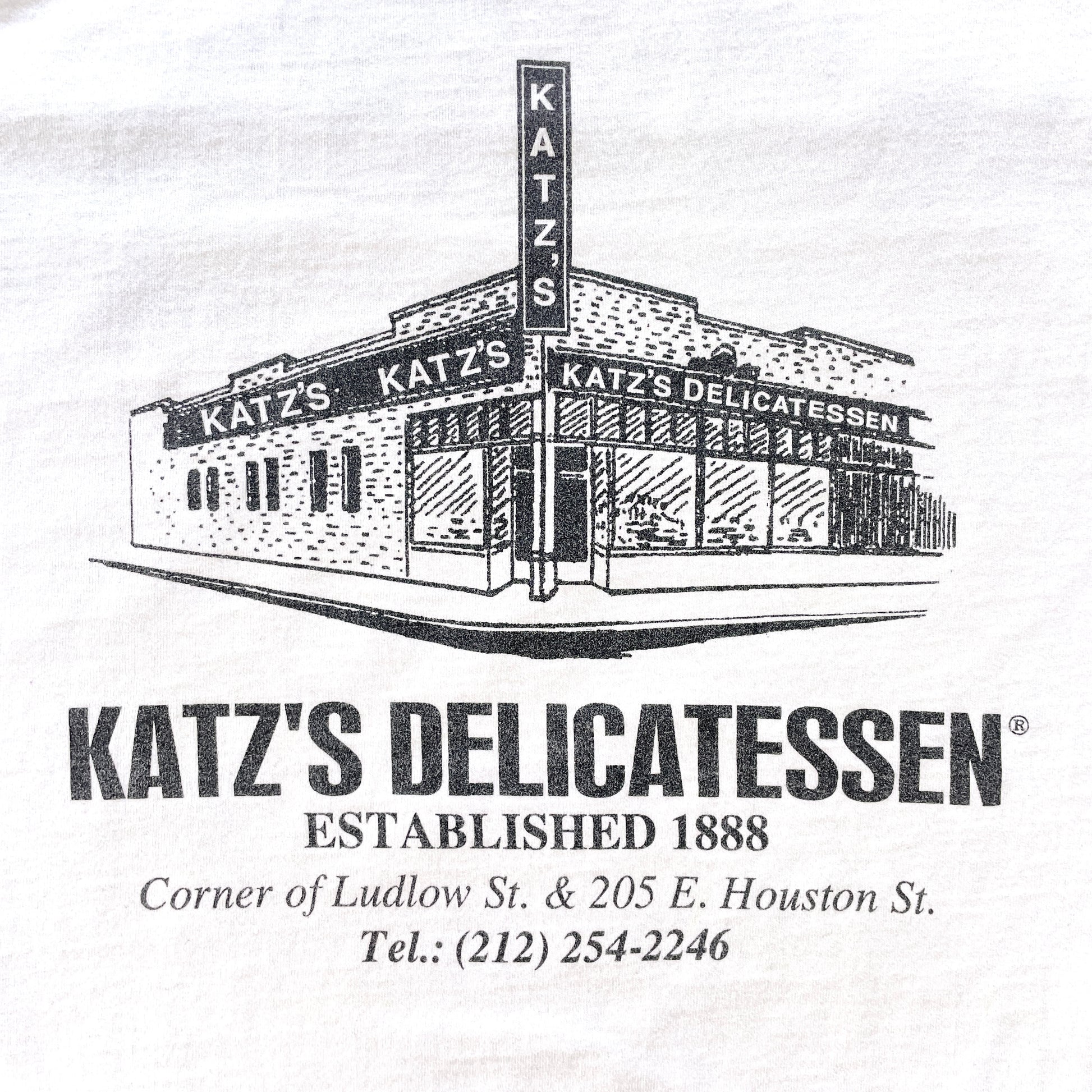 90s Vintage Katz Deli NYC T-Shirt. Graphic printed on white shirt, double sided. Fruit of the Loom.
