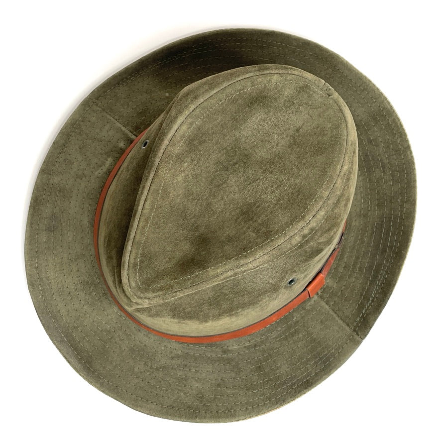Vintage American Eagle leather suede trail hiking hat. Army green suede, brown leather band, beige canvas interior.