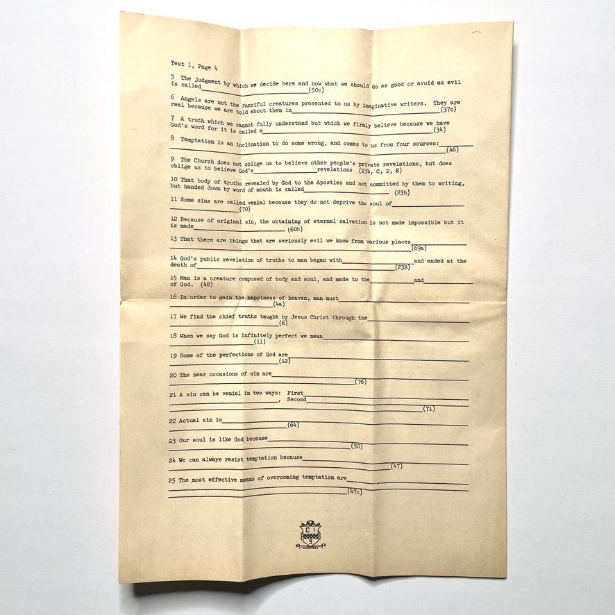 New York City's Catholic Information Society extension course test #1. Four numbered pages on one large folded piece of paper. C.I.S. insignia on back page.