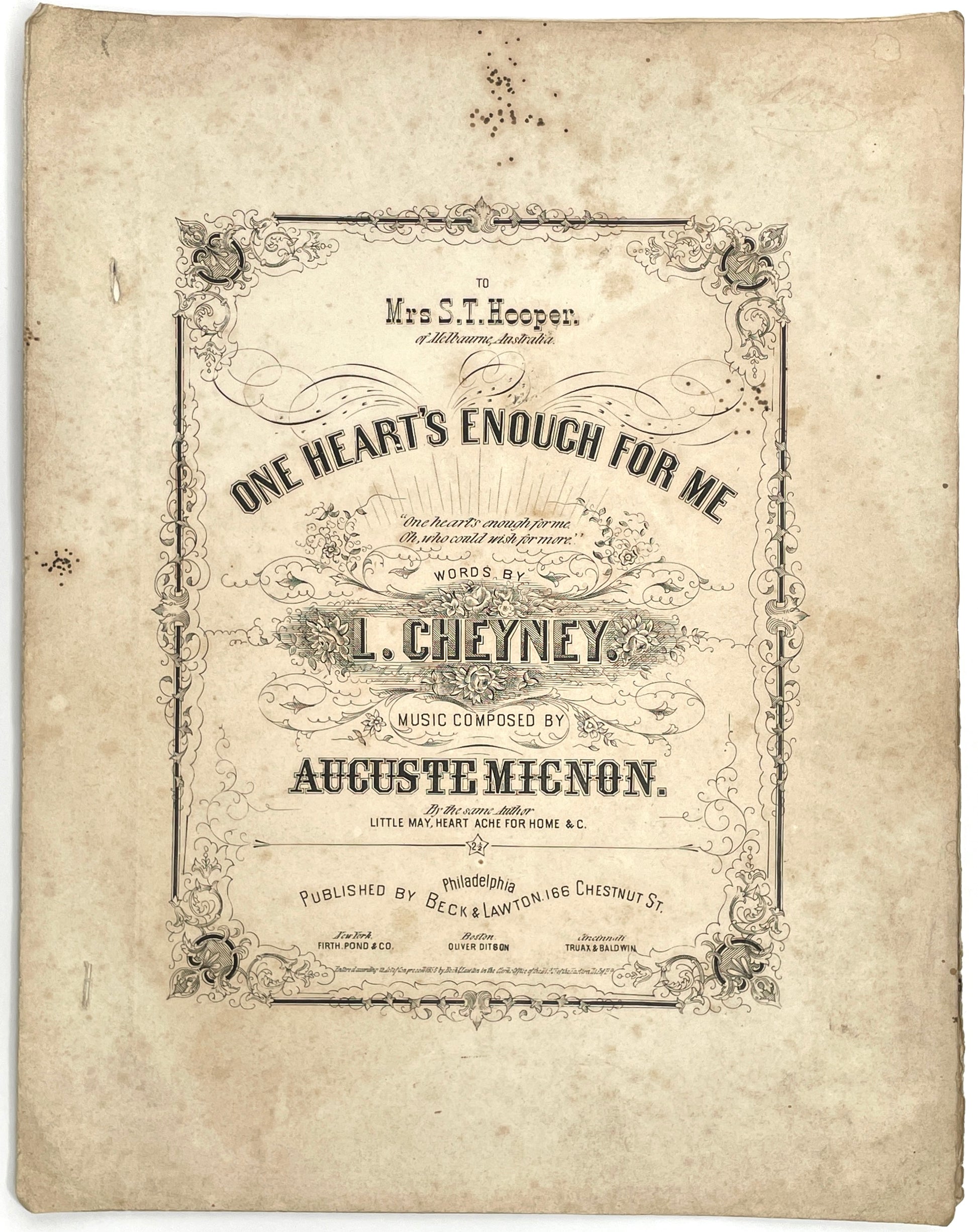 One Heart's Enough For Me by L Cheyney and Auguste Micnon. Published in the 1860s by Beck & Lawton in Philadelphia, PA at 166 Chestnut Street.