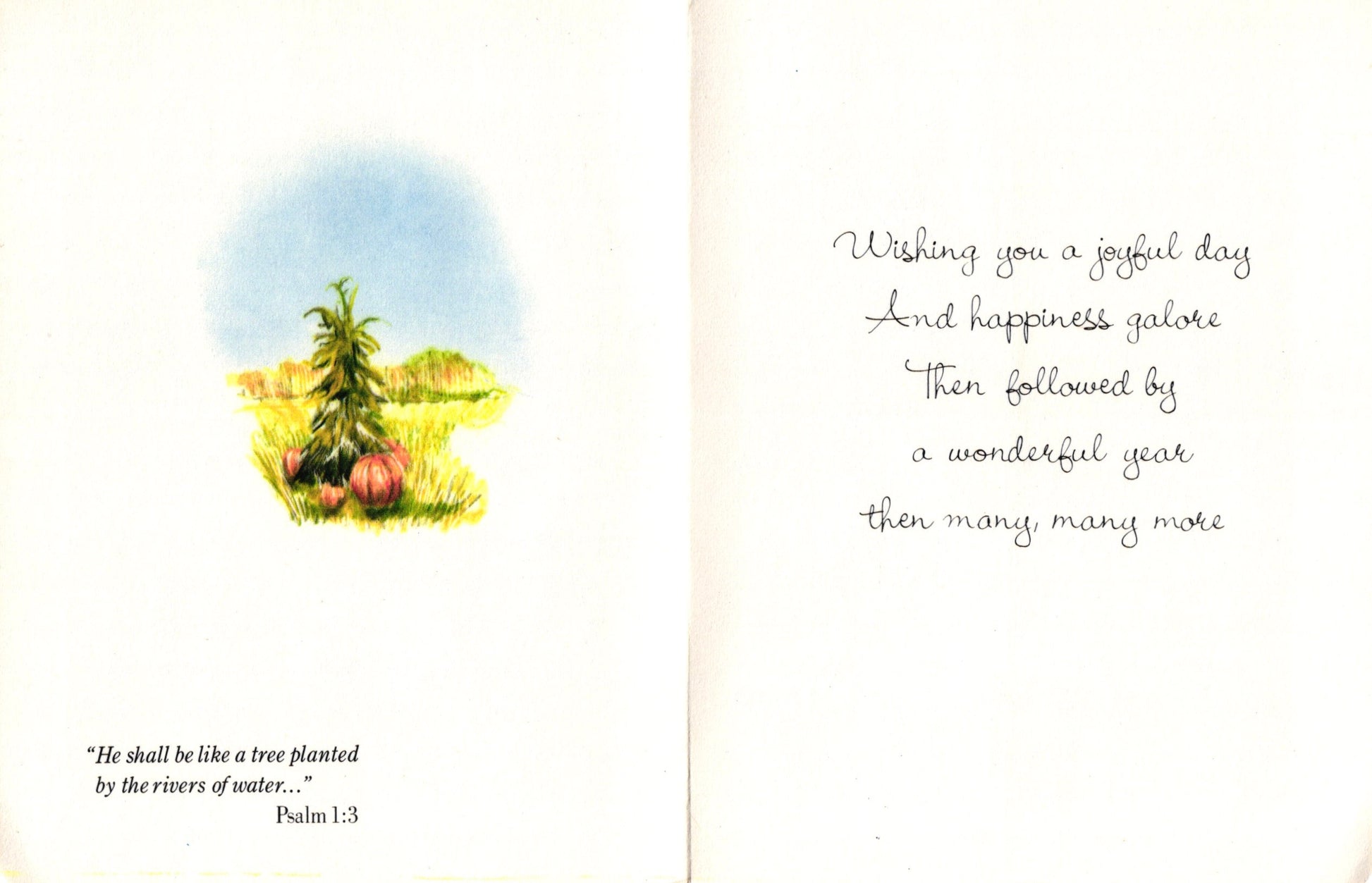 Card features a little girl holding a jackolantern looking up at a bird on top of a haystack. Each Little Helpers card has a bible verse on the interior along with the message. Made by Good Samaritan, 1979. Comes with new generic envelope.