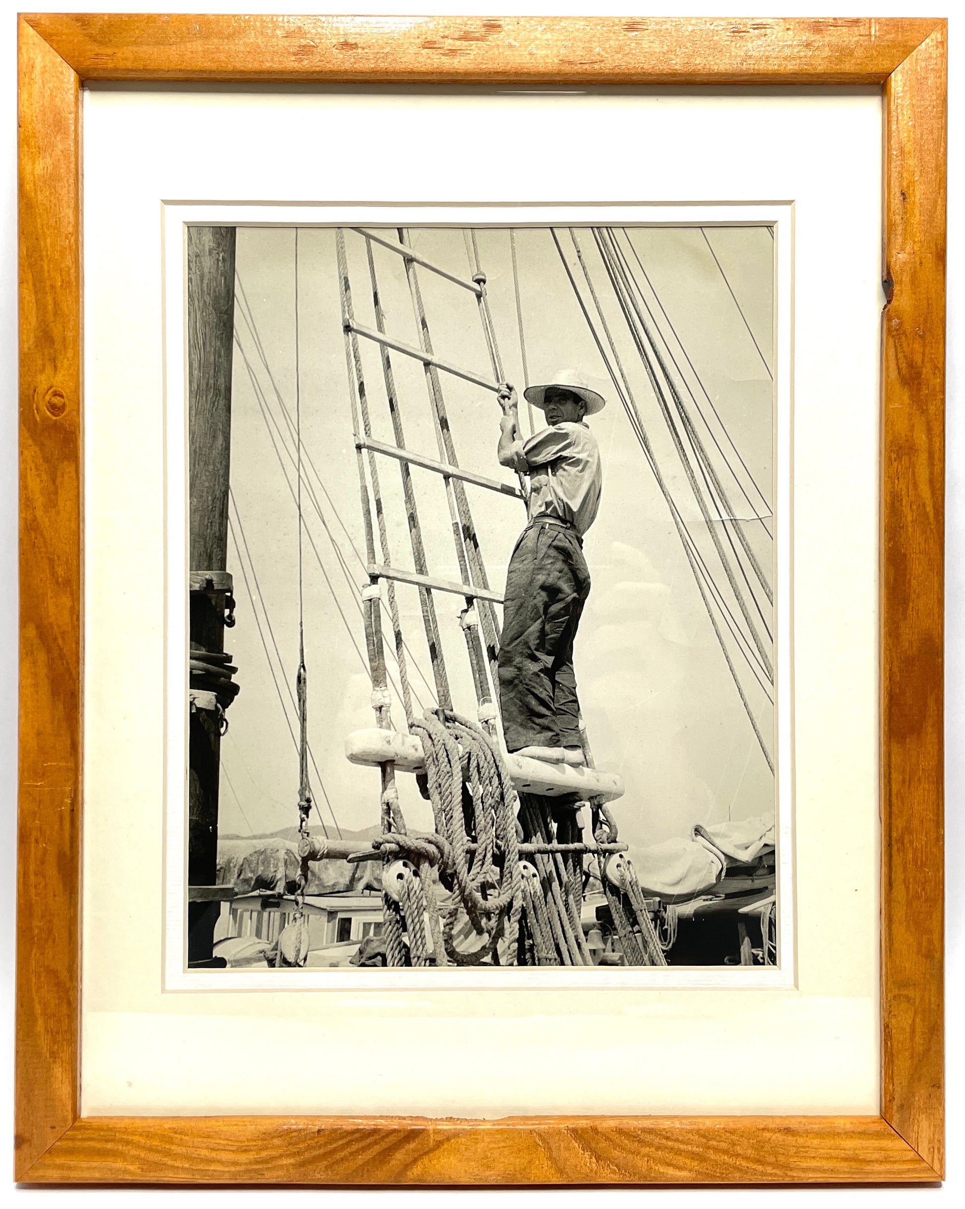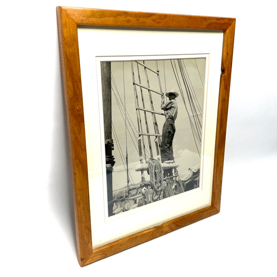 Vintage (exact year unknown) photo of a New England fisherman hanging onto the ropes of a sailing ship. Wooden frame with white and off-white double photo mat.