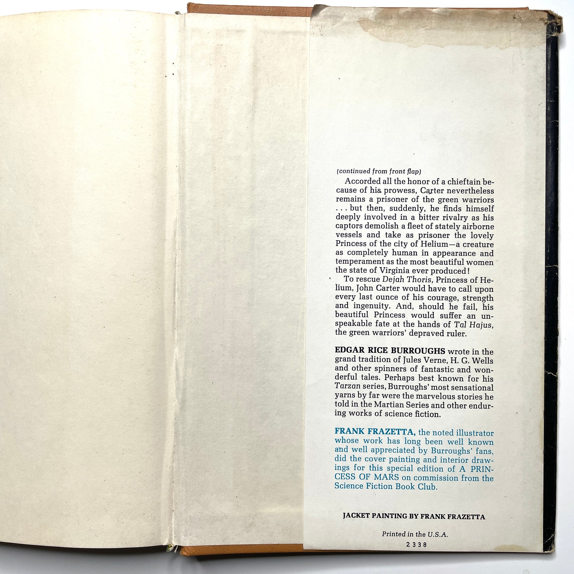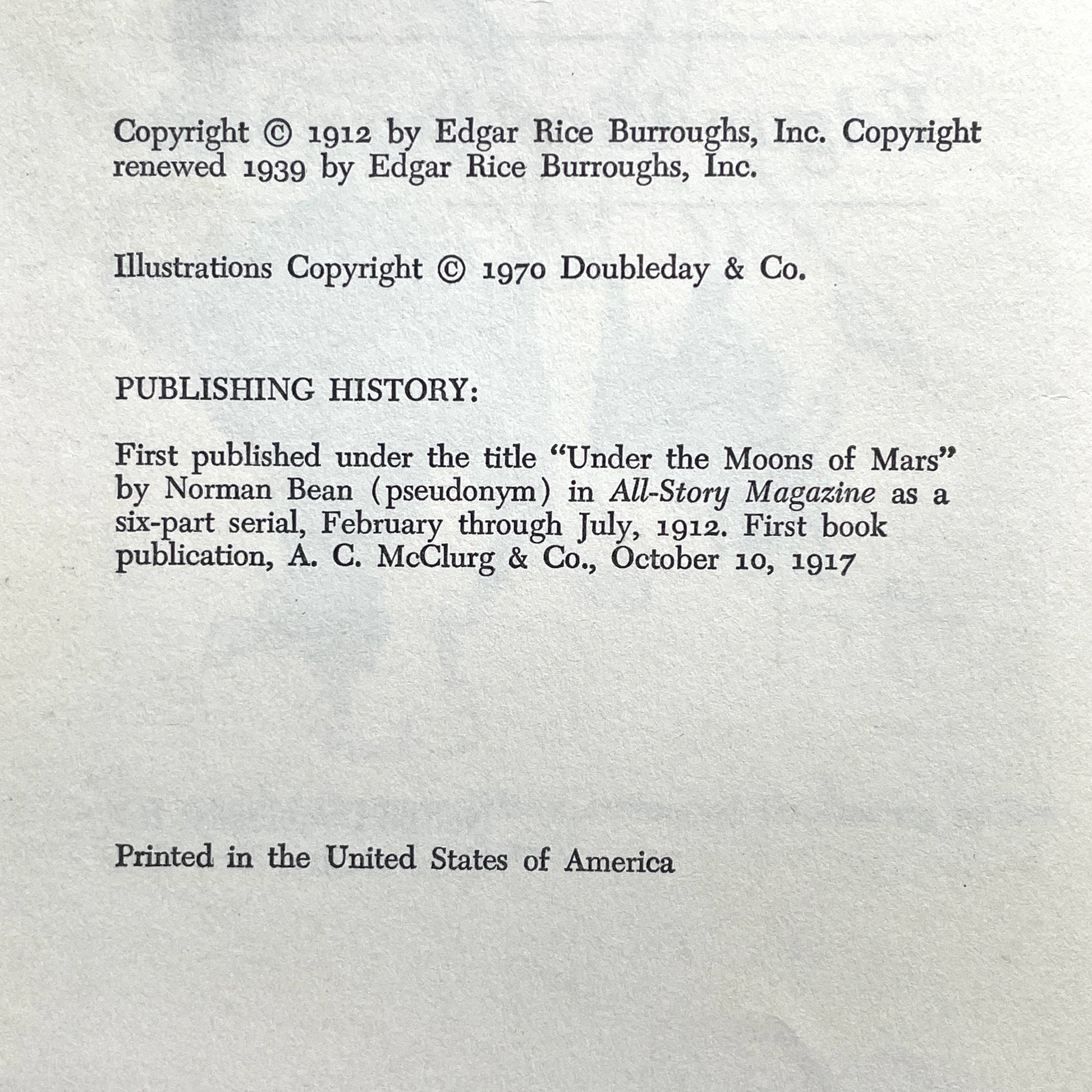 The first book in the Barsoom series written by Edgar Rice Burroughs. First serialized in All-Story Magazine in 1912. This edition was published by Nelson Doubleday in 1970. Book Club Edition hardcover book with dust jacket. Jacket painting and interior drawings by Frank Frazetta.